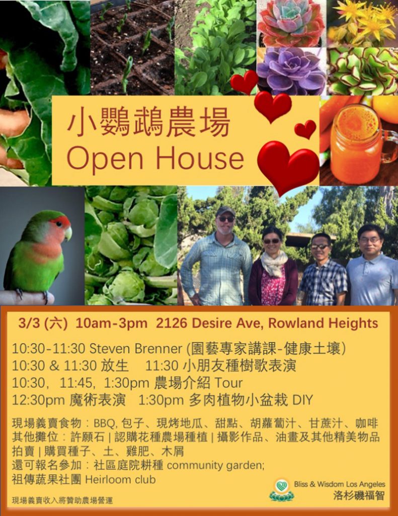 經過兩個多月的規劃及荷鋤整地,慈心農場將正式命名為小鸚鵡農場,並於 3/3 對全體學員做 Open House。 3/3 星期六 早上 10:00 – 下午 3:00 歡迎您攜眷一起來參加!